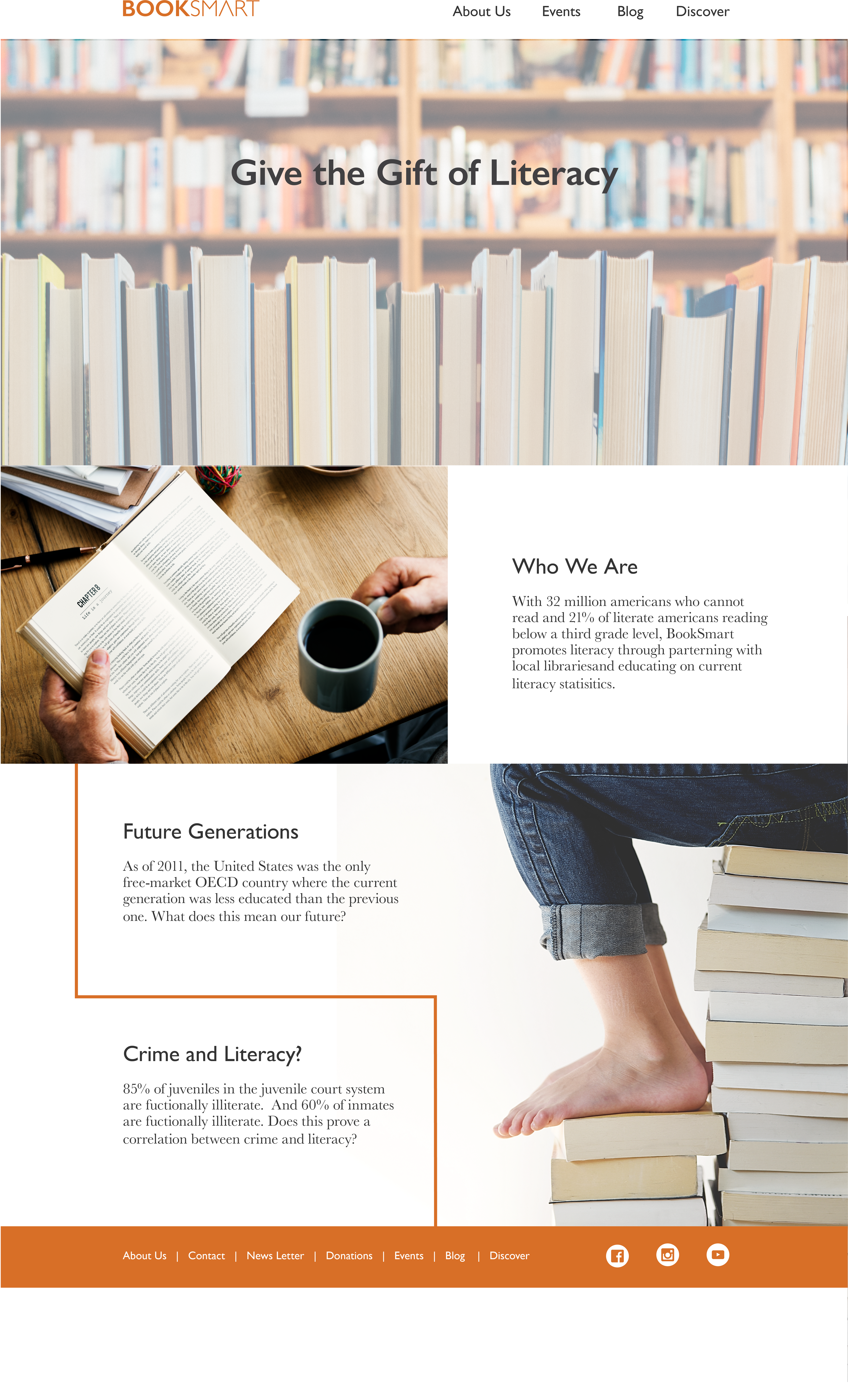 32 million Americans cannot read and 21% of literate Americans read at a third grade level. BookSmart formed in order to spread awareness of the current literacy rate in the United States. The organization sponsors library events, which teach and encourage children and adults to read.